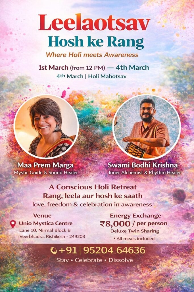Leelotsav is an invitation to celebrate Holi beyond colours — as a sacred meeting of leela (play), hosh (awareness), and heart-led presence. Set in the serene energy of Rishikesh, this immersive retreat blends joy, music, meditation, and conscious celebration.